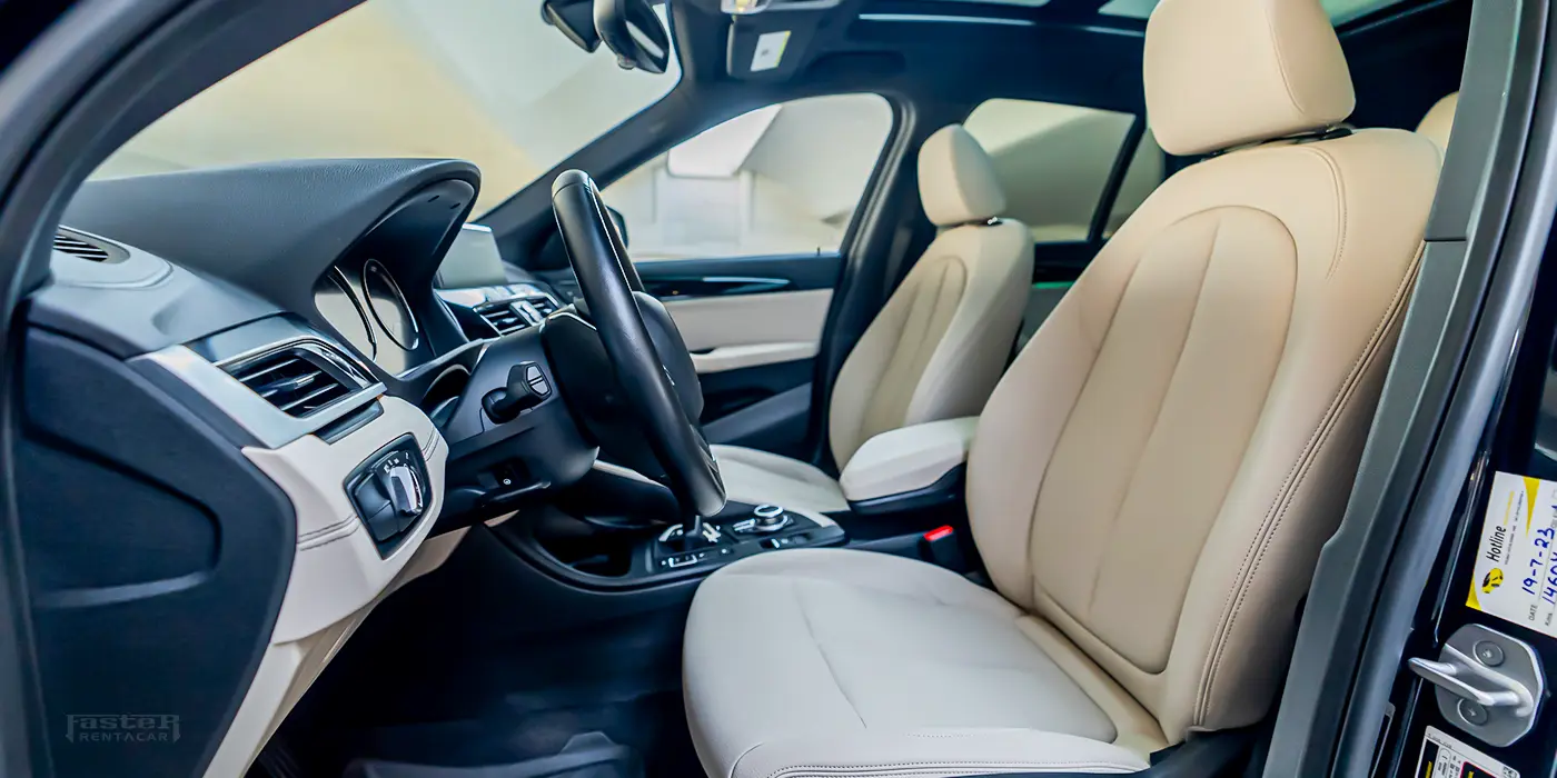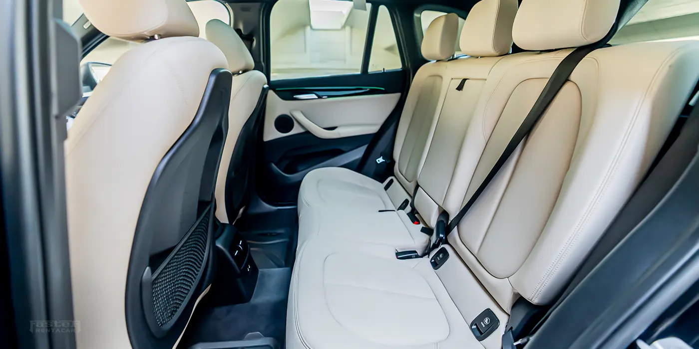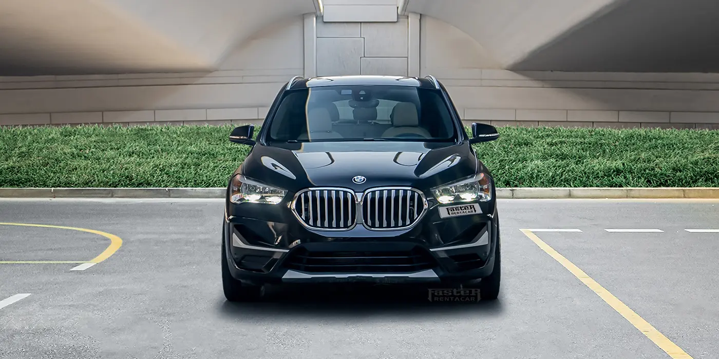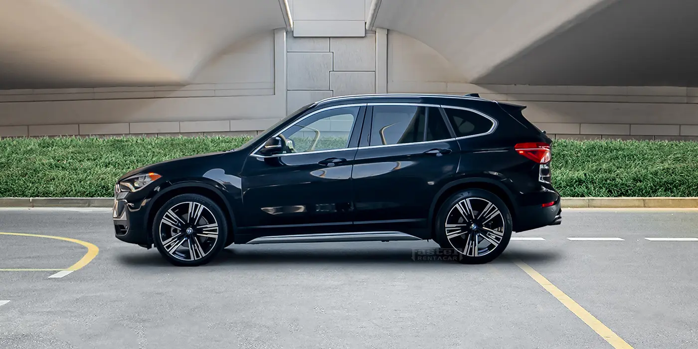 The 2021 BMW X1 finished in grey offers the agility and practicality of a compact luxury SUV. It features a panoramic sunroof and an infotainment system with Android Auto, Apple CarPlay, Bluetooth connectivity, navigation, streaming apps on a touchscreen display, USB ports and voice commands. Comfort amenities include ambient lighting, electric adjustable heated and ventilated leather seats with memory function, rear seat cooling and heating, foldable rear seats, multi‑zone climate control and smart key access. Safety equipment comprises a 360‑degree camera, adaptive cruise control, automatic emergency braking, collision avoidance, lane‑keeping assist, night vision, parking sensors, rear cameras and tyre‑pressure monitoring. Its exterior sports alloy wheels, a subtle body kit, chrome accents, dual exhaust, fog lights, illuminated emblems, LED headlights and roof rails for added versatility.