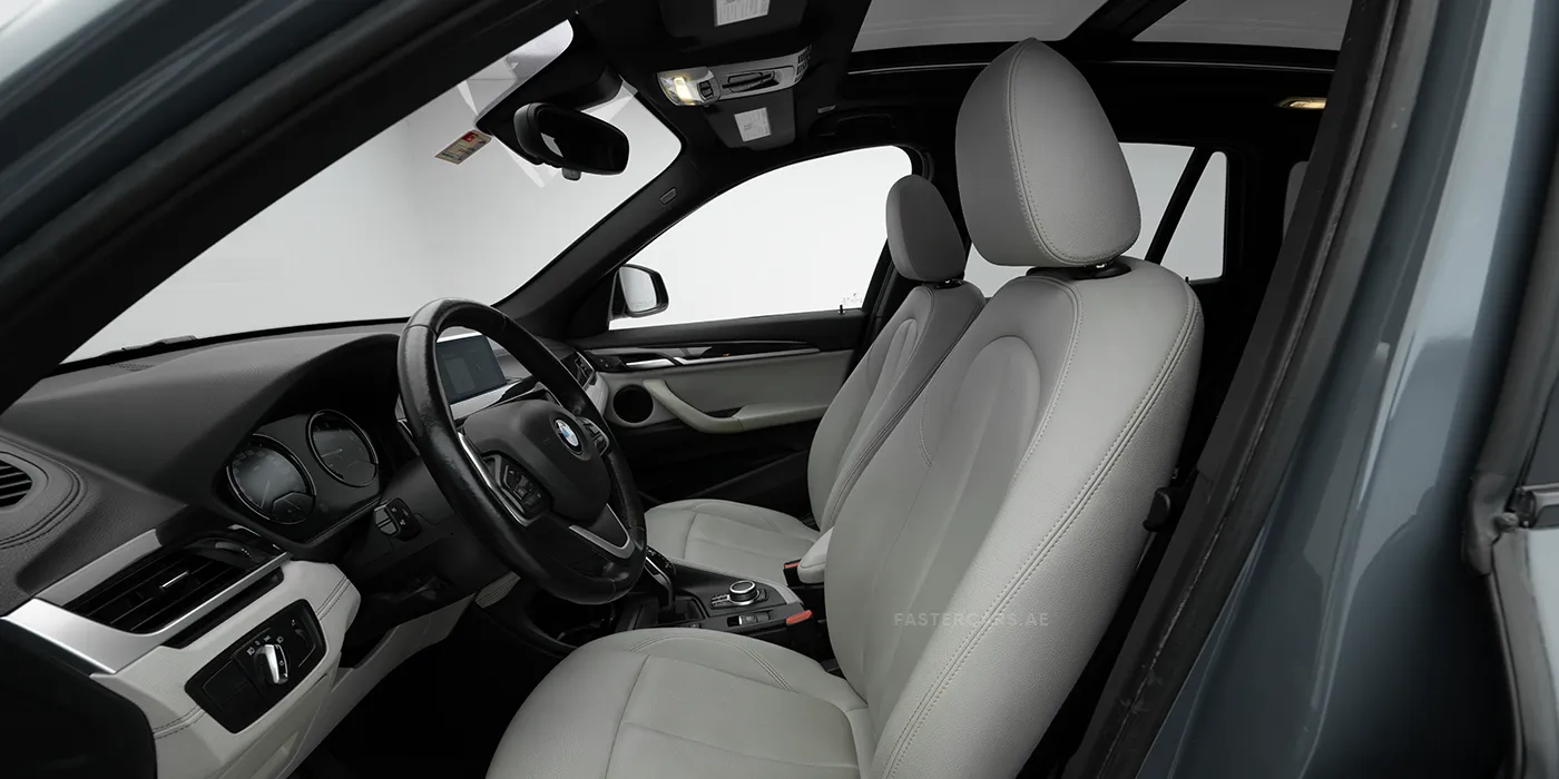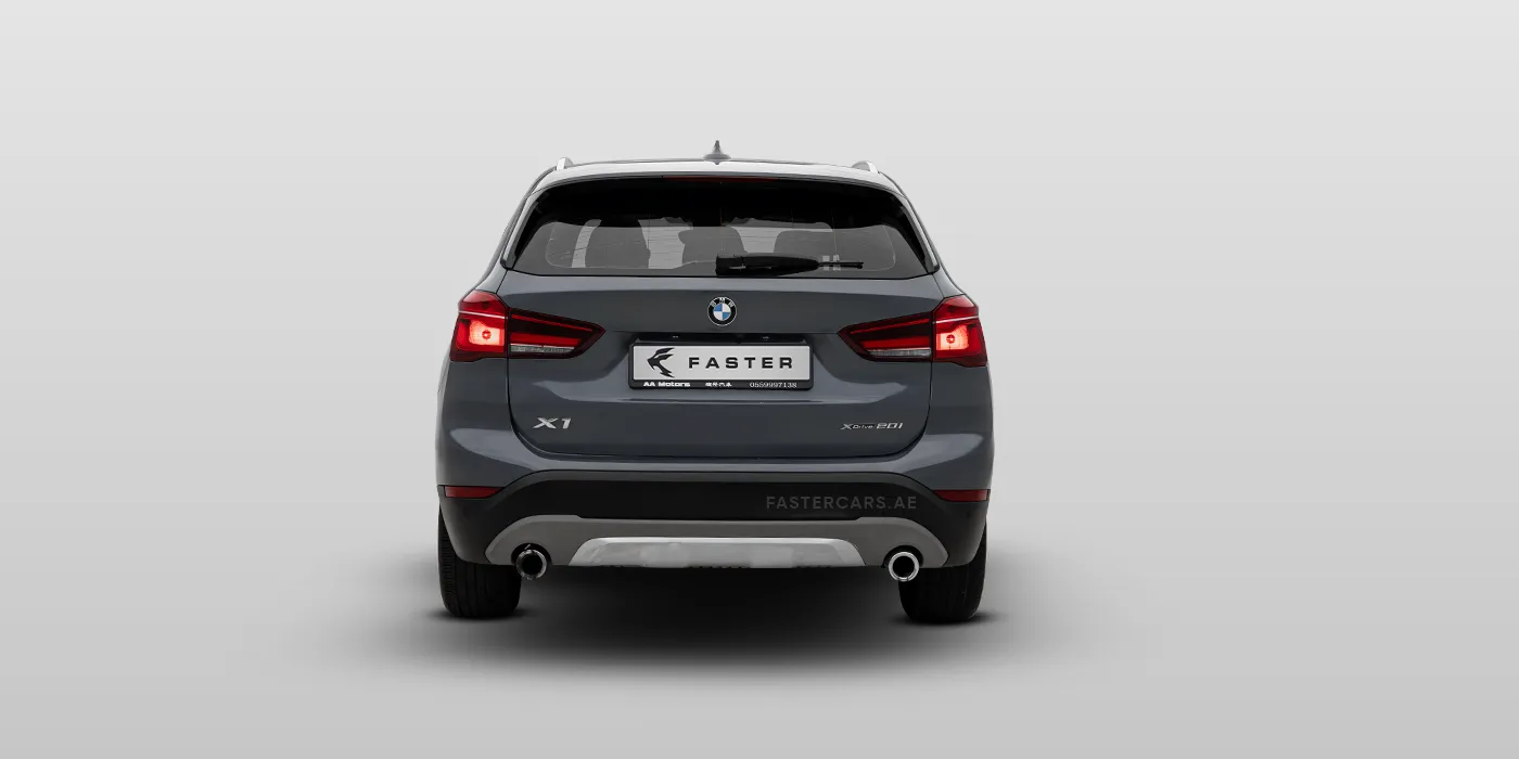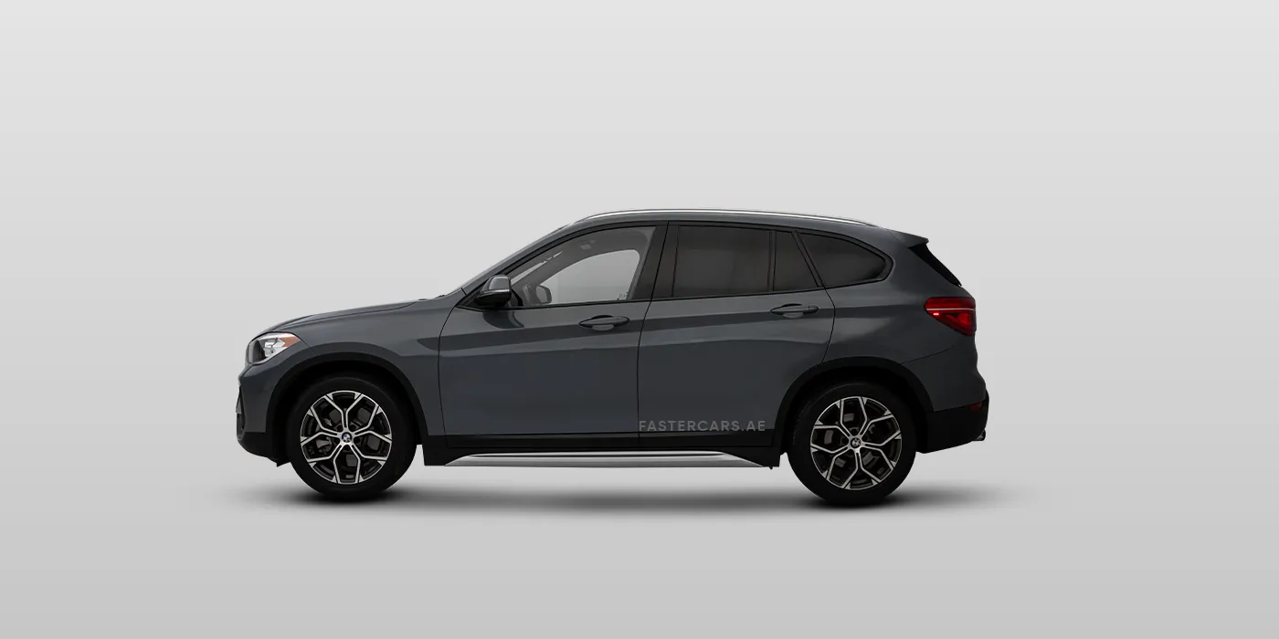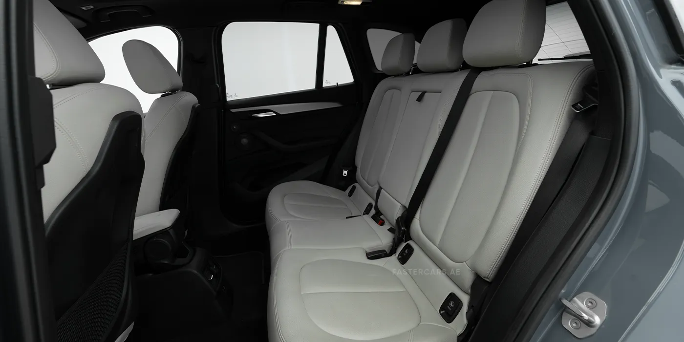 The 2021 BMW X1 finished in grey offers the agility and practicality of a compact luxury SUV. It features a panoramic sunroof and an infotainment system with Android Auto, Apple CarPlay, Bluetooth connectivity, navigation, streaming apps on a touchscreen display, USB ports and voice commands. Comfort amenities include ambient lighting, electric adjustable heated and ventilated leather seats with memory function, rear seat cooling and heating, foldable rear seats, multi‑zone climate control and smart key access. Safety equipment comprises a 360‑degree camera, adaptive cruise control, automatic emergency braking, collision avoidance, lane‑keeping assist, night vision, parking sensors, rear cameras and tyre‑pressure monitoring. Its exterior sports alloy wheels, a subtle body kit, chrome accents, dual exhaust, fog lights, illuminated emblems, LED headlights and roof rails for added versatility.