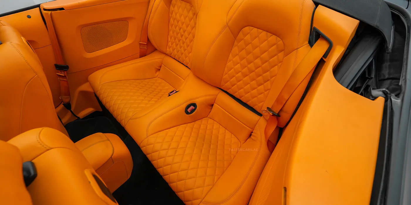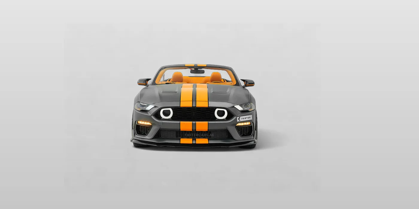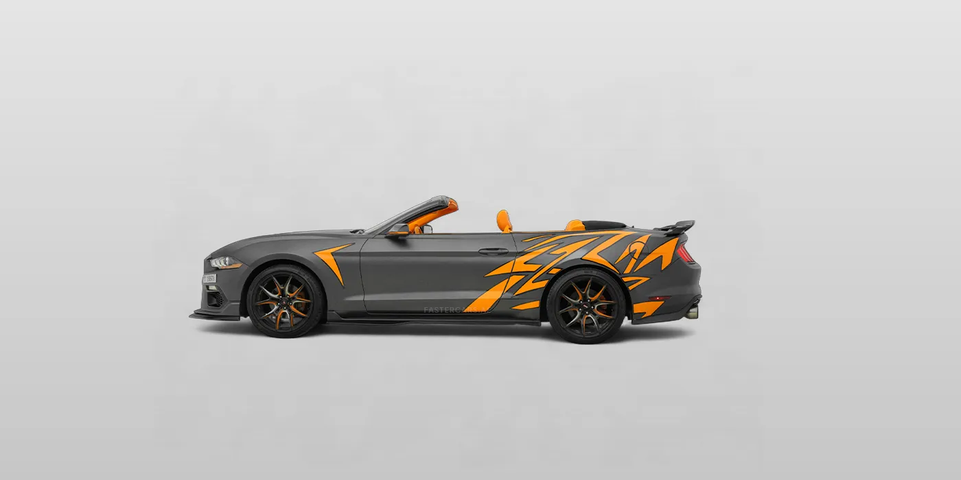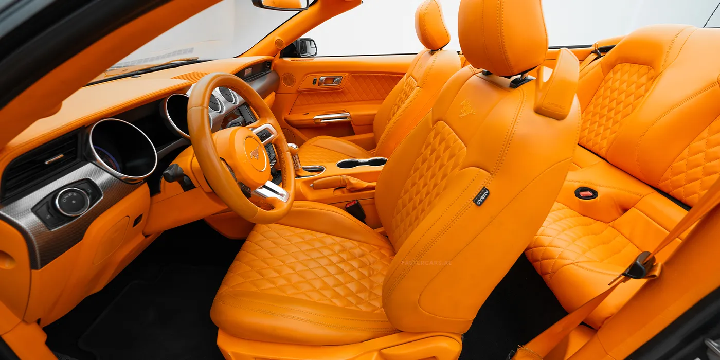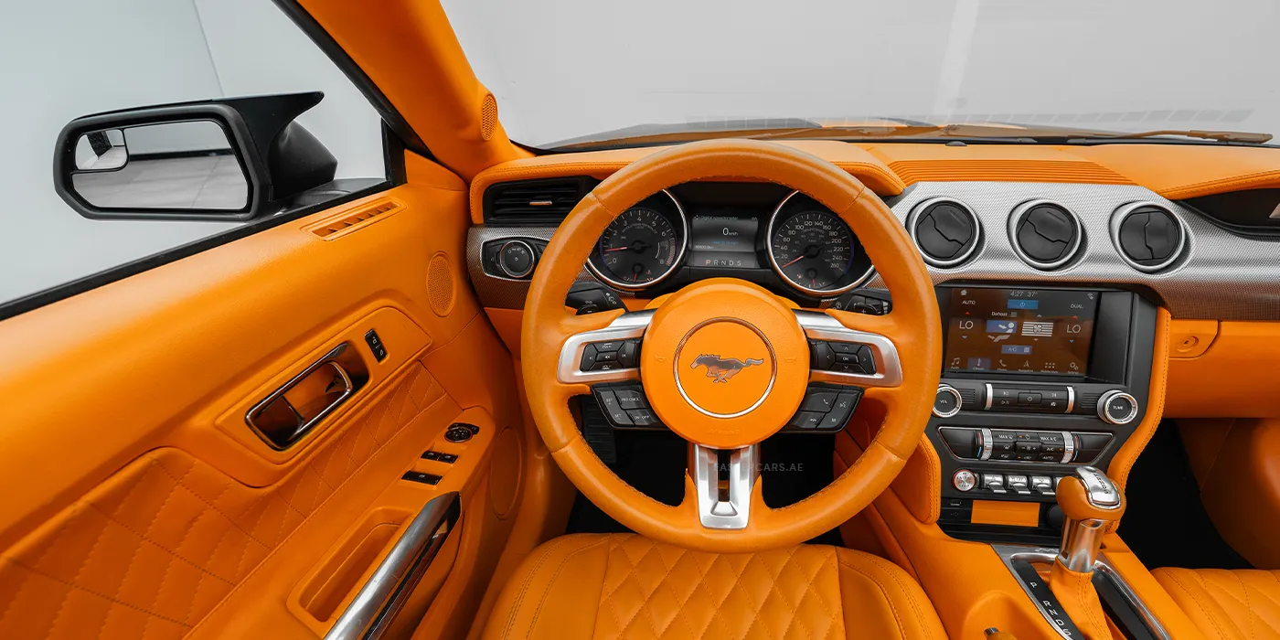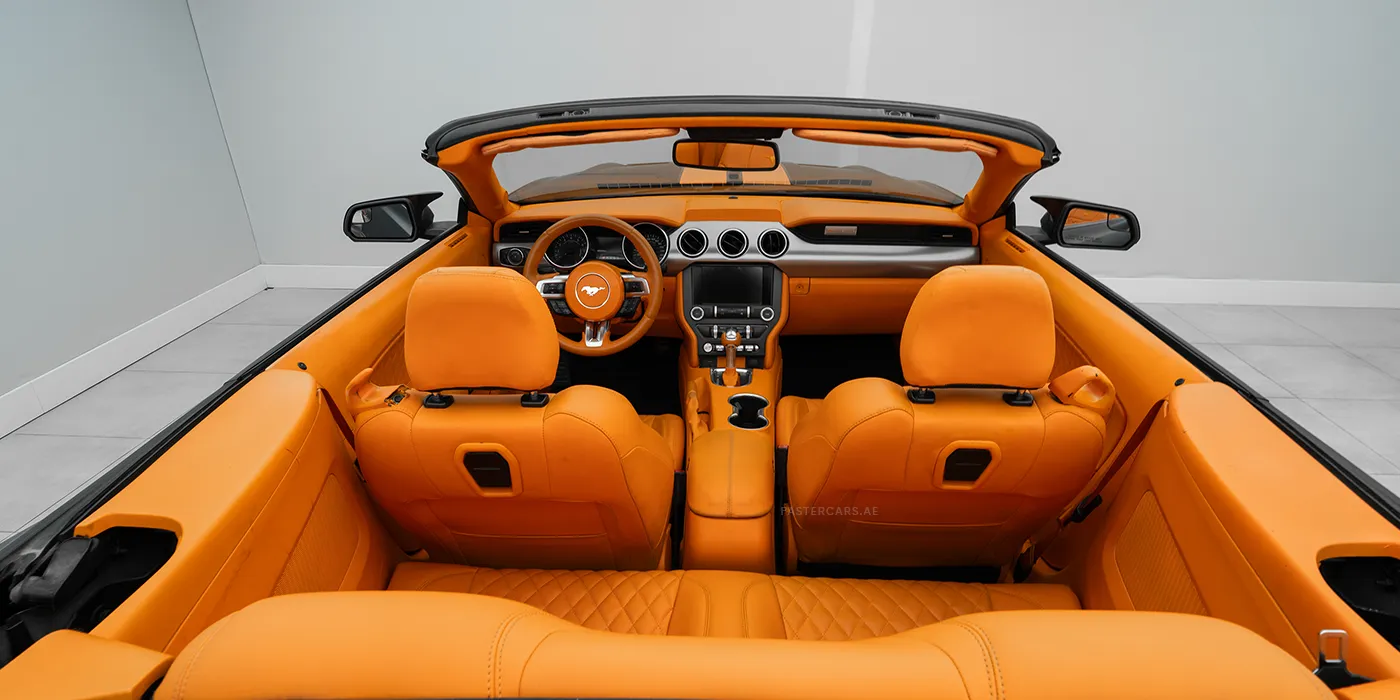 A 2019 Ford Mustang convertible finished in black with a striking yellow interior. The soft‑top roof brings open‑air excitement while modern technology like Android Auto, Apple CarPlay, Bluetooth connectivity, voice commands and a touchscreen navigation system keep you informed and entertained. The cabin offers electrically adjustable heated and ventilated leather seats with smart key entry for comfort and convenience. Safety equipment includes adaptive cruise control, night vision assist, parking sensors, rear cameras and a tyre‑pressure monitoring system. Distinctive exterior touches such as alloy wheels, a body kit with dual exhausts, fog lights, illuminated emblems, LED headlights and a rear spoiler complete the Mustang’s sporty yet premium character.