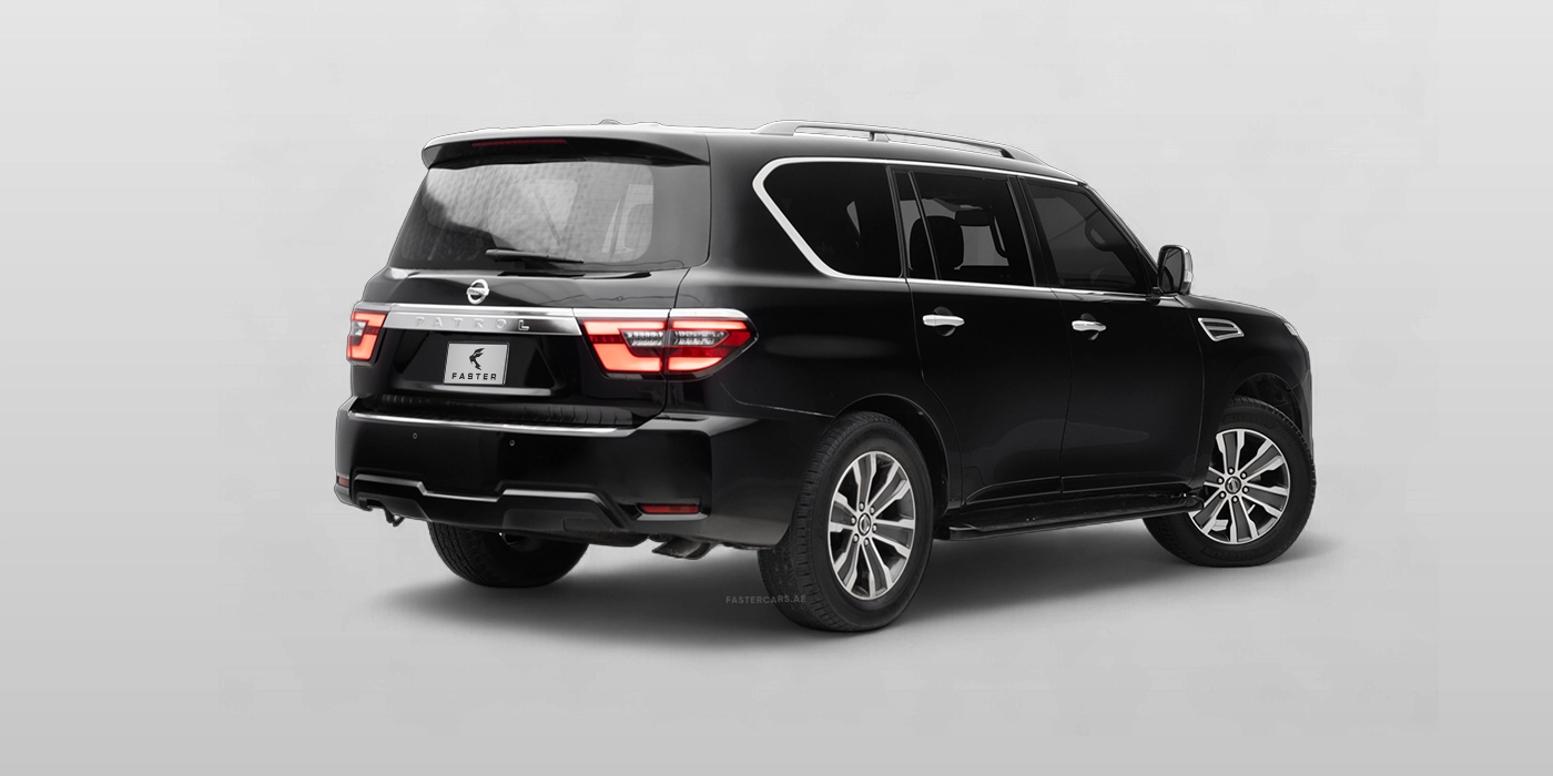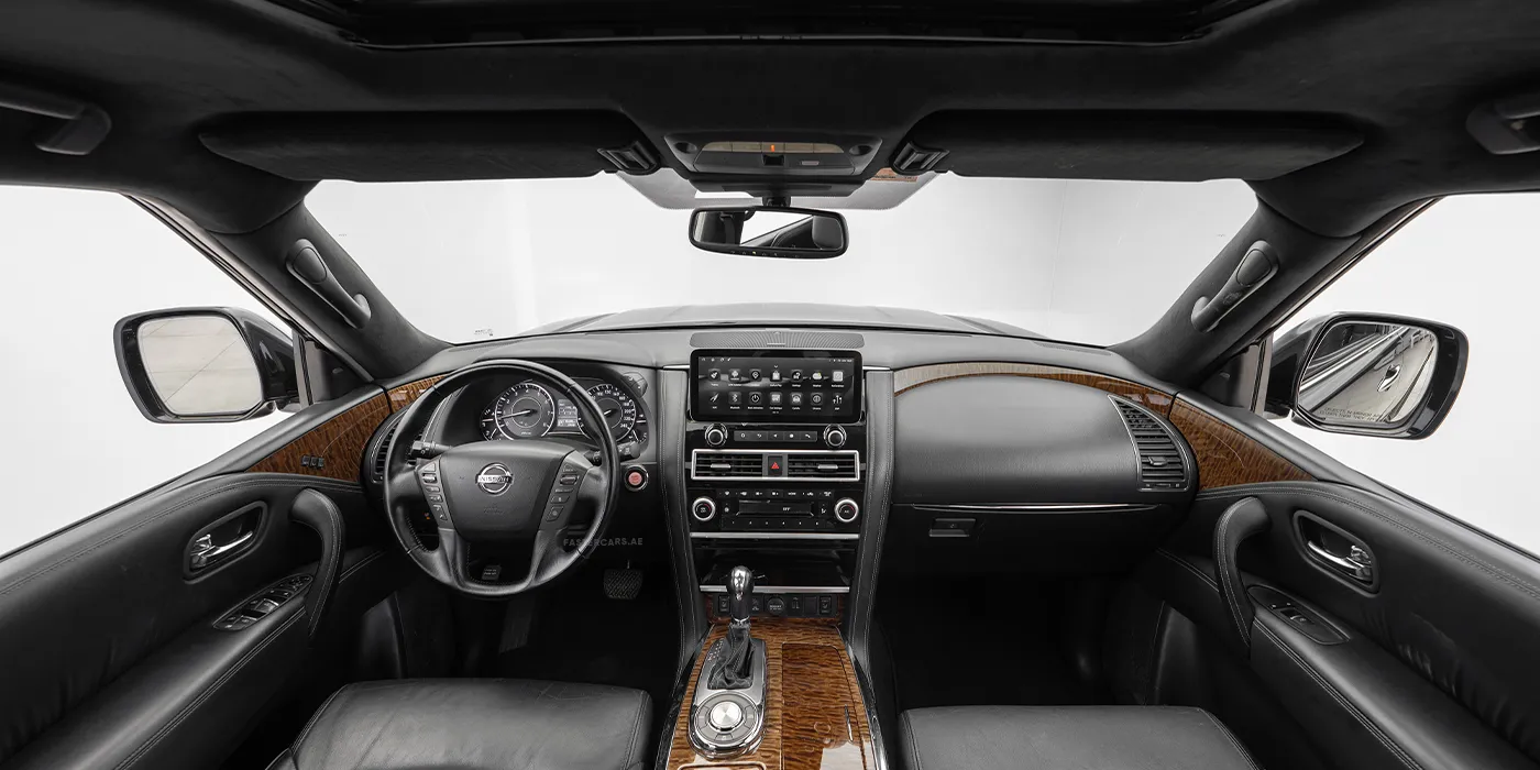 The 2019 Nissan Patrol in black is a luxury family‑friendly SUV seven‑seater that combines high‑tech convenience with comfort and features a sun roof. It offers Android Auto, Apple CarPlay, Bluetooth connectivity, a navigation system, streaming apps, a large touchscreen display, USB ports and voice commands. Inside, passengers enjoy electric adjustable leather seats with heating and memory settings, ambient lighting, smart key integration, rear seat cooling and heating and multi‑zone climate control, while foldable rear seats add practicality. Safety equipment includes a 360‑degree camera system, adaptive cruise control, automatic emergency braking, blind‑spot monitoring, a collision avoidance system, front cameras, lane‑keeping assist, night vision, parking sensors, rear cameras and a tyre‑pressure monitoring system. Exterior details such as adaptive LED headlights, alloy wheels, a sporty body kit, chrome accents, dual exhaust outlets, electric folding mirrors, fog lights, illuminated emblems, LED headlights, roof rails, tinted windows and running boards give it a commanding yet sophisticated look.