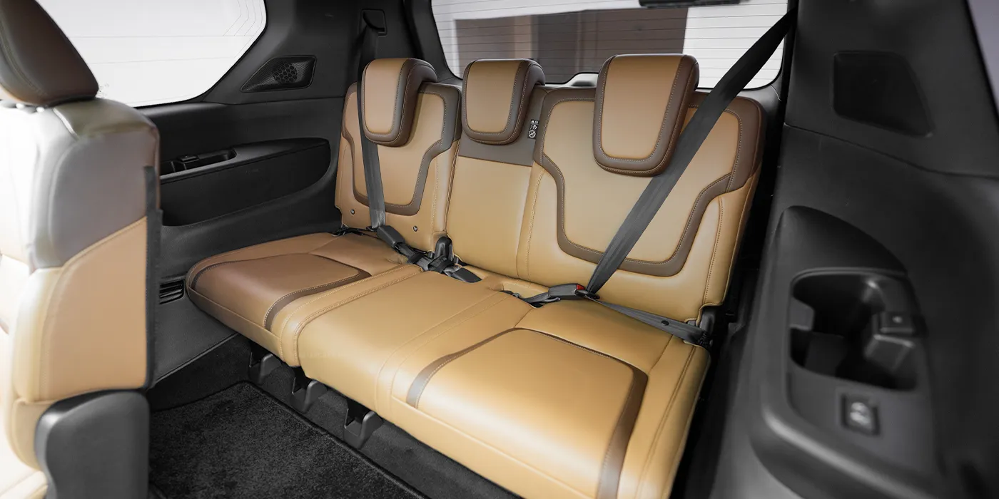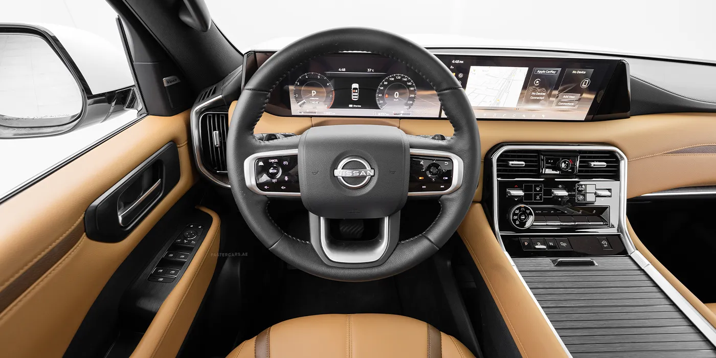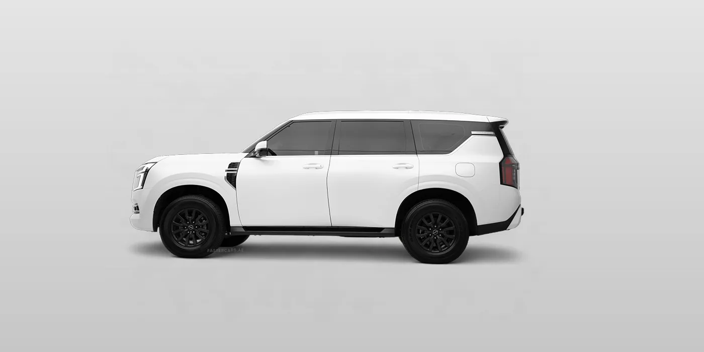 The 2025 Nissan Patrol in white is a luxury family‑friendly full‑size SUV seven‑seater that pairs modern technology with refined comfort and features a panoramic roof. It offers Android Auto, Apple CarPlay, Bluetooth connectivity, a navigation system, streaming apps, a large touchscreen display, USB ports, voice commands and wireless charging. Inside, passengers enjoy electric adjustable leather seats with heating, ventilation and massage, a cooling box, multi‑zone climate control, rear seat cooling and heating and smart key integration, while foldable rear seats add practicality. Safety equipment includes a 360‑degree camera system, adaptive cruise control, automatic emergency braking, blind‑spot monitoring, a collision avoidance system, lane‑keeping assist, night vision, parking sensors, rear cameras and a tyre‑pressure monitoring system. Exterior details such as alloy wheels, a sporty body kit, chrome accents, fog lights, illuminated emblems, LED headlights, roof rails, running boards and tinted windows give it a commanding yet sophisticated look.